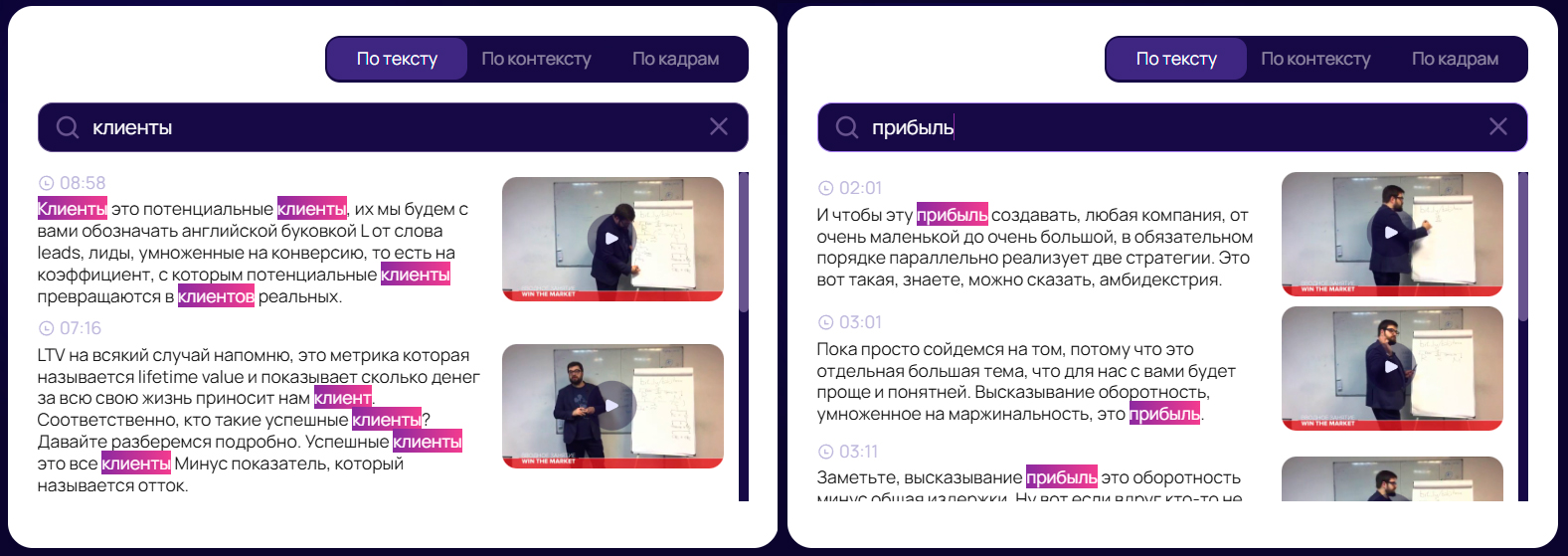 После этого пользователь может искать внутри видео по любой из модальностей — и получать точные фрагменты с таймкодами, где встречается нужная информация.