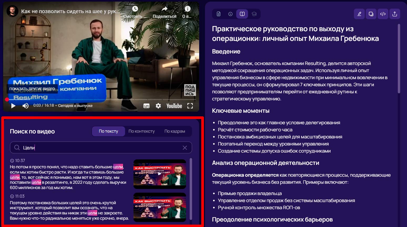 и получаете точные фрагменты — с таймкодами и контекстом, готовые к просмотру или монтажу.