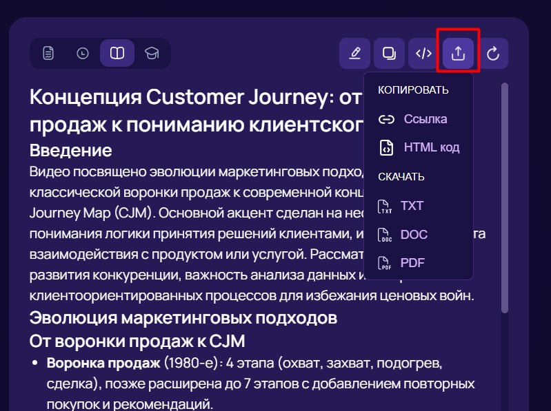 Все результаты можно редактировать вручную и экспортировать в PDF, DOCX, TXT или напрямую интегрировать в LMS.