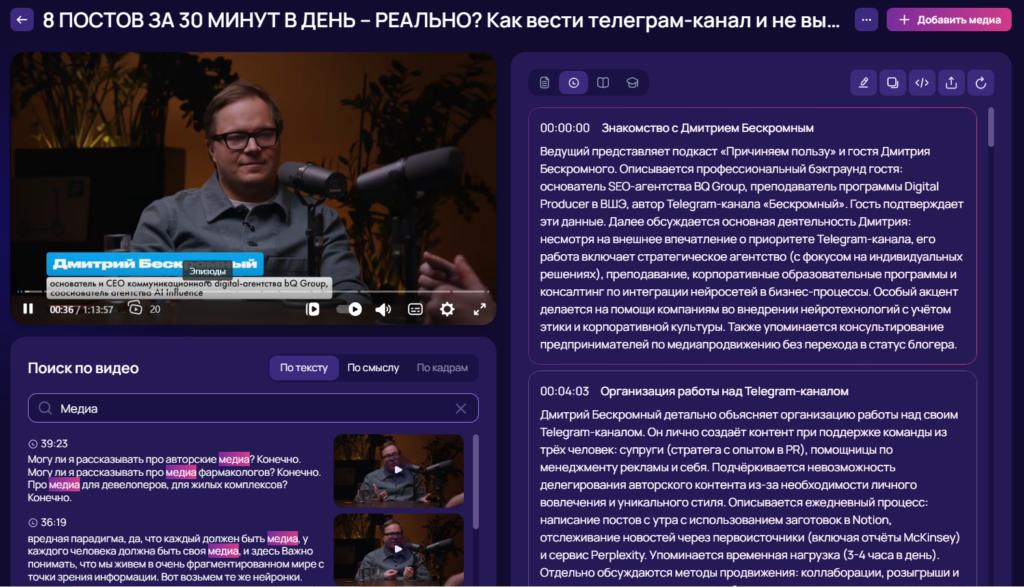 - Журналисты и аналитики: работайте с интервью и выступлениями. Транскрибация видео в текст по ссылке позволяет быстро цитировать, анализировать и сравнивать сказанное.