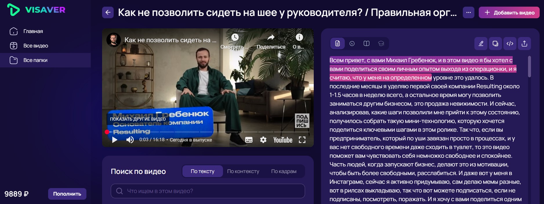 - Поиск по видео: Позволяет мгновенно находить нужные фрагменты в видео по ключевым словам в транскрибированном тексте.